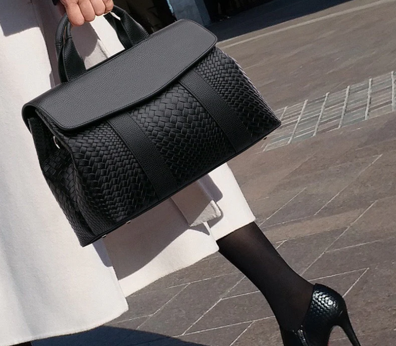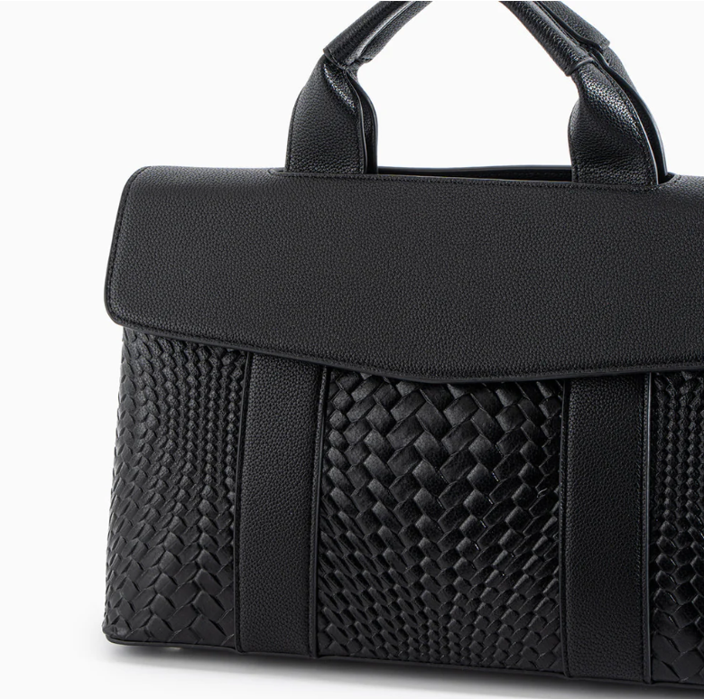 • Mixed Texture Detailing: The body of the bag is accented with vertical panels featuring a detailed woven or basketweave (Intrecciato-style) texture, contrasted by smooth leather on the top flap and handles.