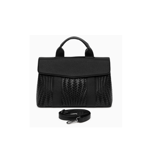 Introducing the classic and versatile Black Structured Top-Handle Satchel, a sophisticated accessory designed for the professional and stylish individual. Its structured silhouette and mixed textures make it a timeless addition to any wardrobe.