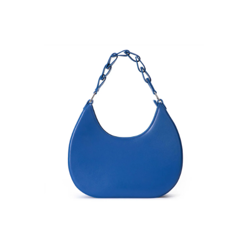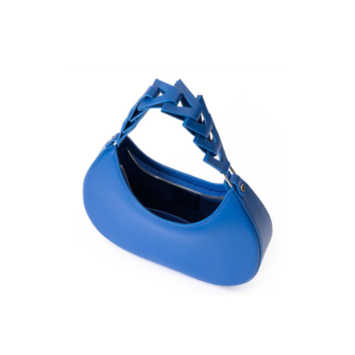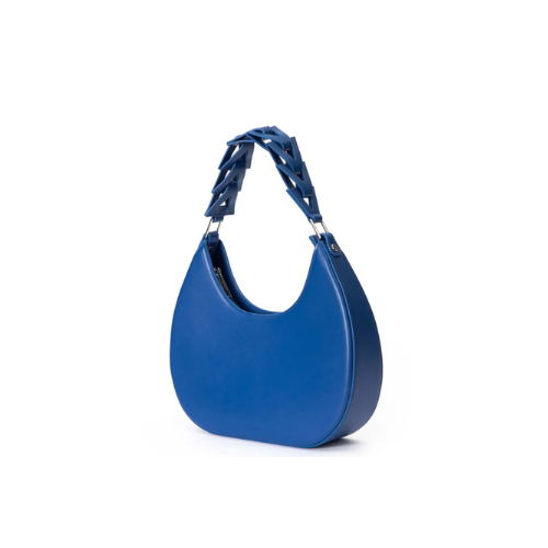 This striking shoulder bag features a bold royal blue color and a sleek, contemporary crescent shape. The body is crafted from smooth, high-quality material, giving it a minimalist and polished look. The main design element is the unique interlocking strap, which is composed of chunky, geometric links in the same vibrant blue, attaching to the bag with silver-tone hardware. This modern strap transforms the bag into a true statement piece. Its compact size is perfect for carrying essentials for an evening out or adding a pop of color and texture to a day outfit. Ideal for customers seeking a trendy, vibrant accessory with a unique, eye-catching handle design.